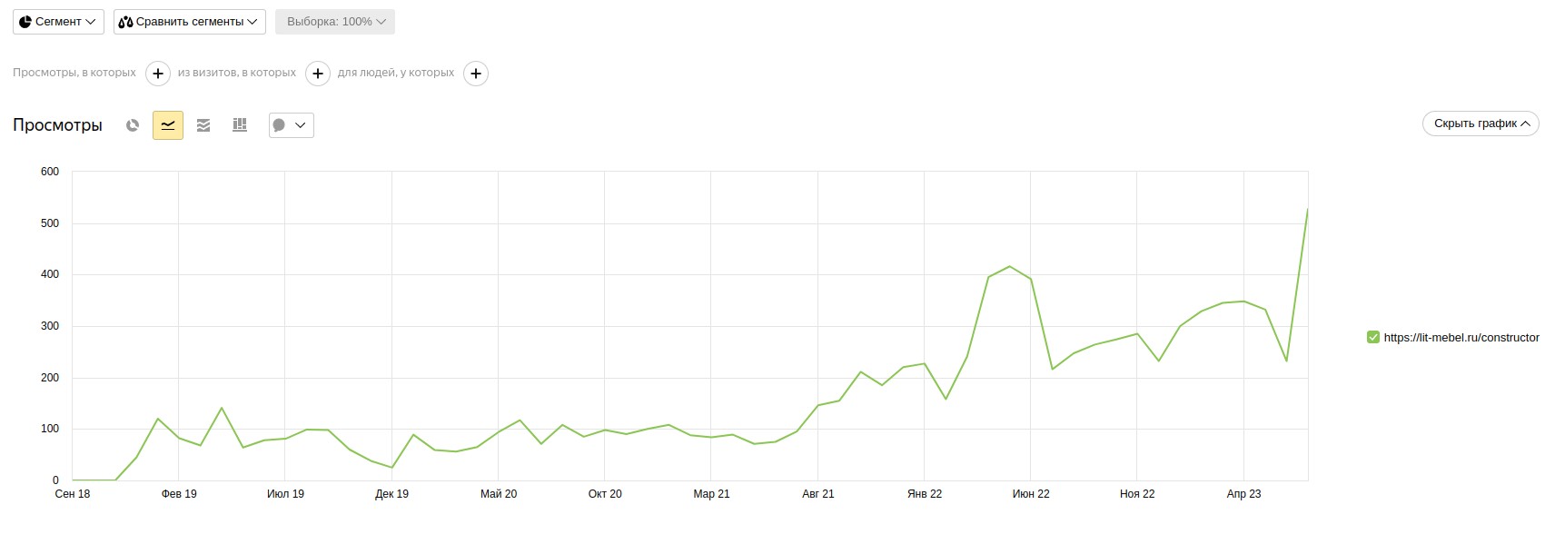 Для дополнительного привлечения пользователей мы внедрили функционал конструктора мебели, который позволяет создавать индивидуальные шкафы по своим параметрам. Этот инструмент не только предоставляет уникальное преимущество сайта, но и стимулирует конверсию за счет удобства и персонализации. С помощью этого сайт добился значительного роста поискового трафика, увеличения конверсии и привлечения новых пользователей.