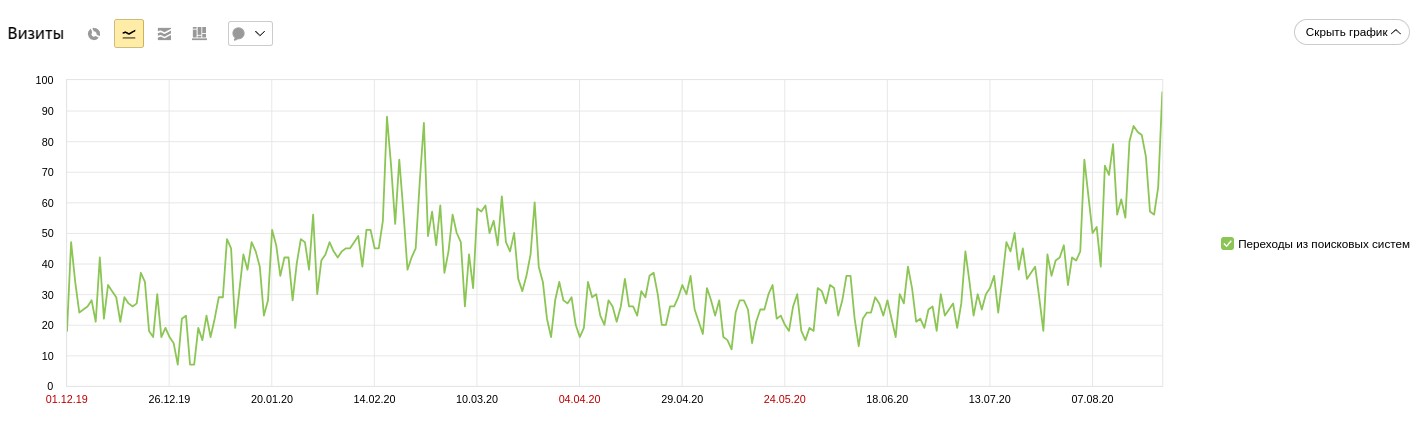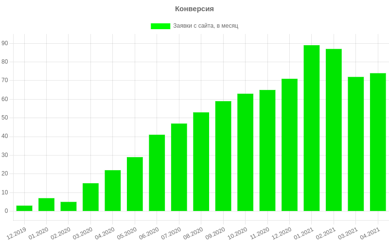 В процессе работы мы постоянно анализировали и дорабатывали продвигаемые страницы и запросы, улучшали индексацию сайта поисковыми роботами, а также работали над коммерческими, техническими и поведенческими факторами. Особое внимание уделялось внешним факторам: мы получали естественные ссылки через региональные каталоги, справочники, сервисы отзывов и тематические порталы. Регулярная и системная работа принесла впечатляющие результаты, особенно в конверсии: при росте посещаемости сайта в 8,5 раз, число заявок увеличилось в 26 раз, а в сезонные пики (январь-февраль, начало марта, начало сентября и т.д.) — в 39!